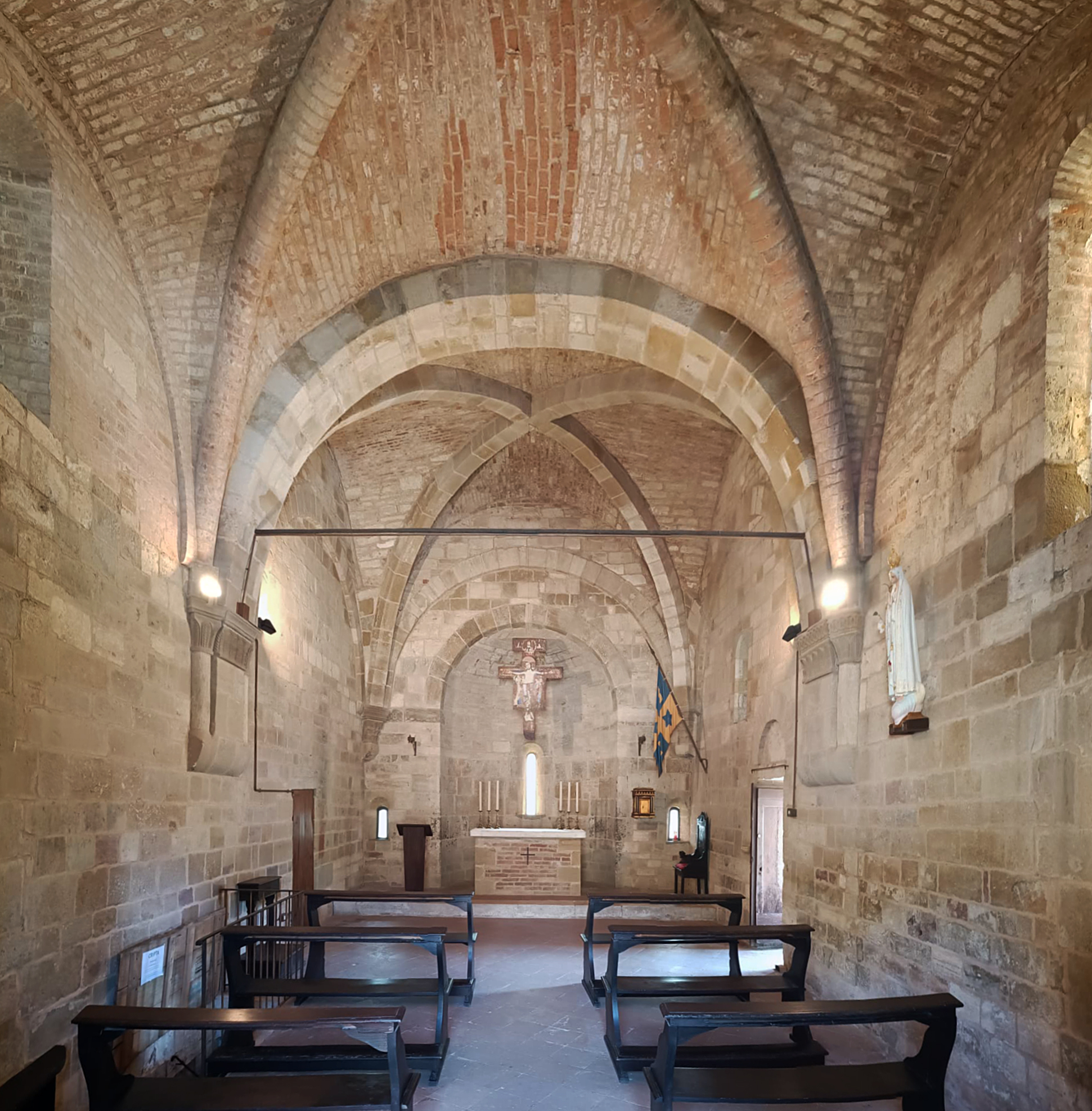 La chiesa è in stile romanico e, tanto all’interno quanto all’esterno è ornata con rilievi di derivazione lombarda; la medesima influenza è riscontrabile anche nell’architettura, che può essere messa in relazione con quella della non lontana chiesa abbaziale di Sant’Antimo (prima metà del XII secolo). L’edificio si articola in un’unica navata di due campate con volta a crociera, e abside semicircolare; in corrispondenza della seconda campata vi è la caratteristica cripta, suddivisa in navatelle da sette colonnine.